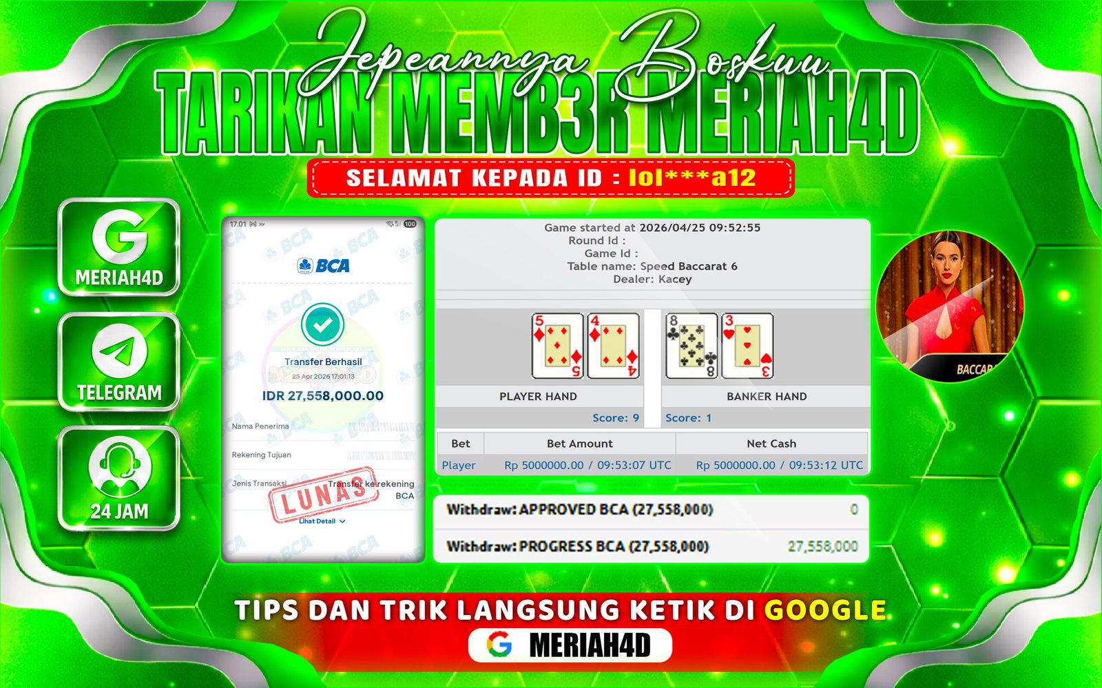 Selamat Kepada ID : lol***a12 Atas Withdraw Rp. 27.558.000 Juta Hari ini. Ditunggu Withdraw Selanjutnya dan ajak juga teman temannya bergabung di Meriah4d