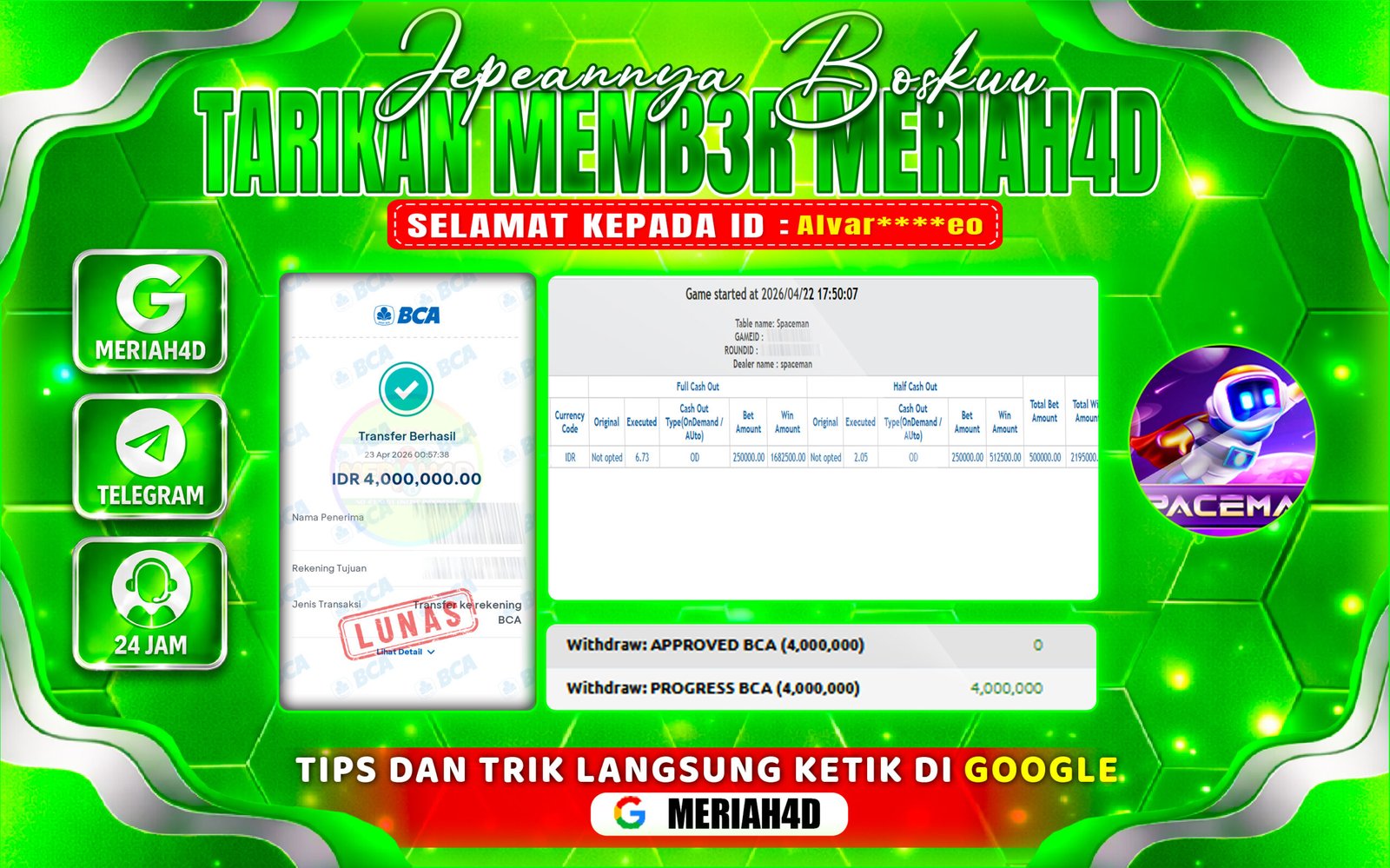Selamat Kepada ID : Alvar****eo Atas Withdraw Rp. 4.000.000 Juta Hari ini. Ditunggu Withdraw Selanjutnya dan ajak juga teman temannya bergabung di Meriah4d