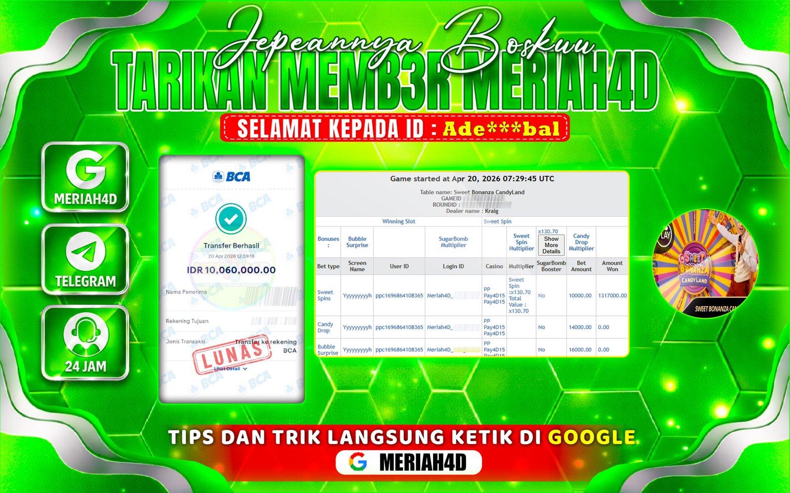 Selamat Kepada ID : Ade***bal Atas Withdraw Rp. 10.060.000 Juta Hari ini. Ditunggu Withdraw Selanjutnya dan ajak juga teman temannya bergabung di Meriah4d