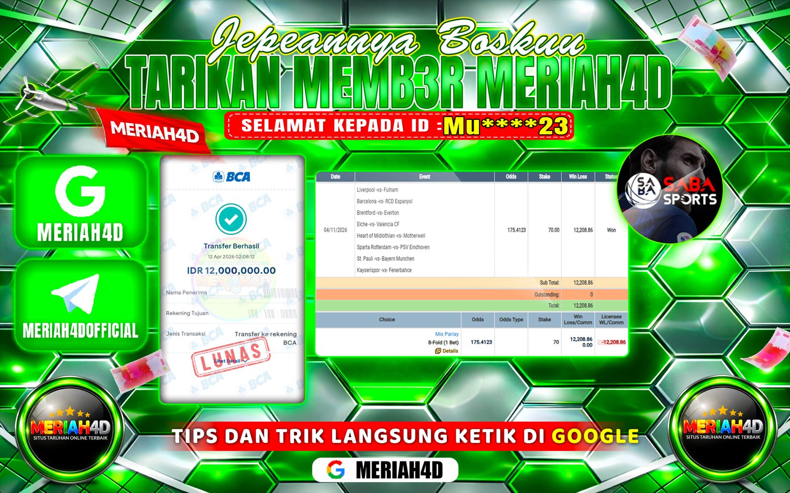 Selamat Kepada Id : Mu****23 Atas Withdraw Rp. 12.000.000 Juta Hari ini. Ditunggu Withdraw Selanjutnya dan ajak juga teman temannya bergabung di Meriah4d