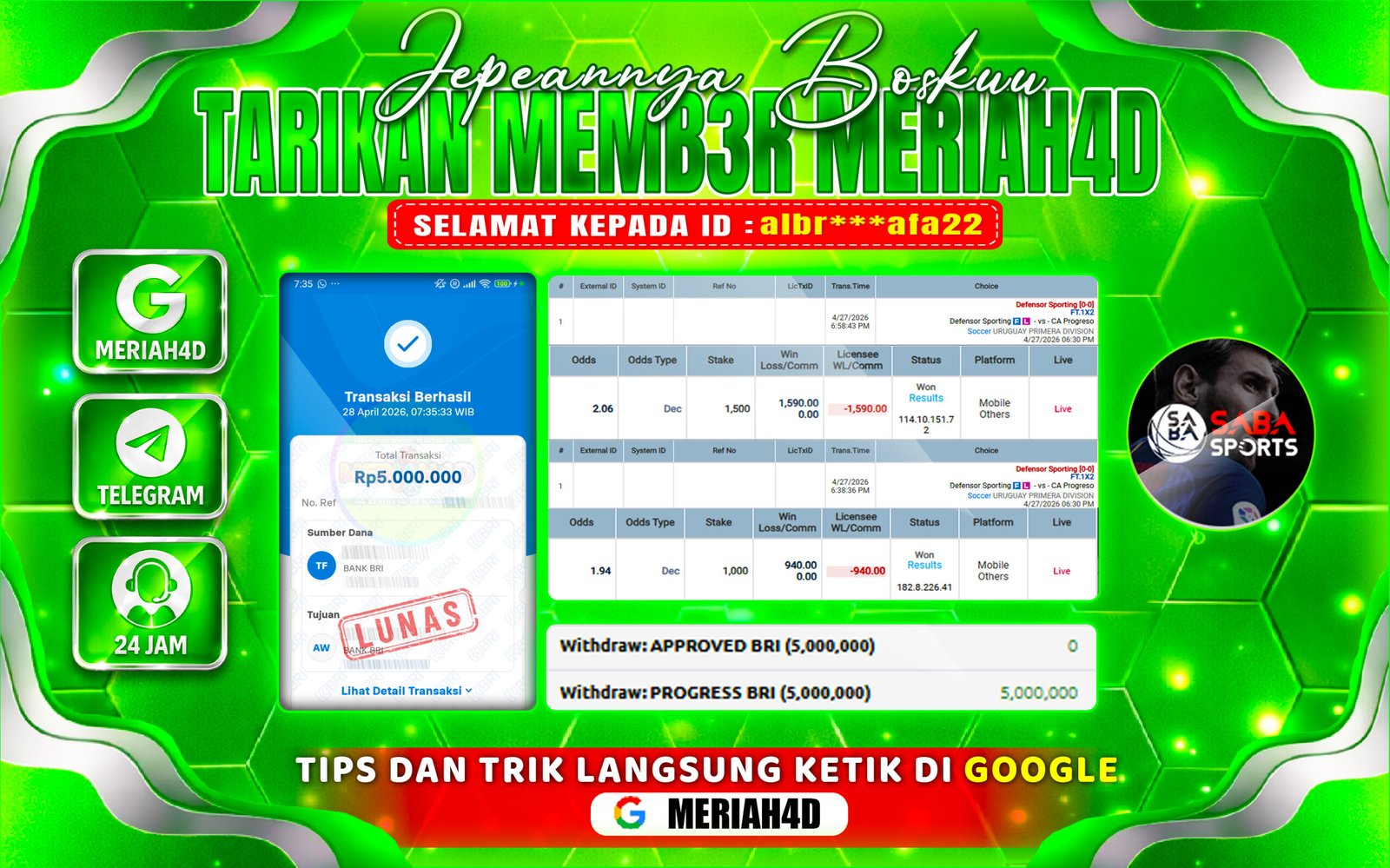Selamat Kepada Id : albr***afa22 Atas Withdraw Rp. 5.000.000 Juta Hari ini. Ditunggu Withdraw Selanjutnya dan ajak juga teman temannya bergabung di Meriah4d