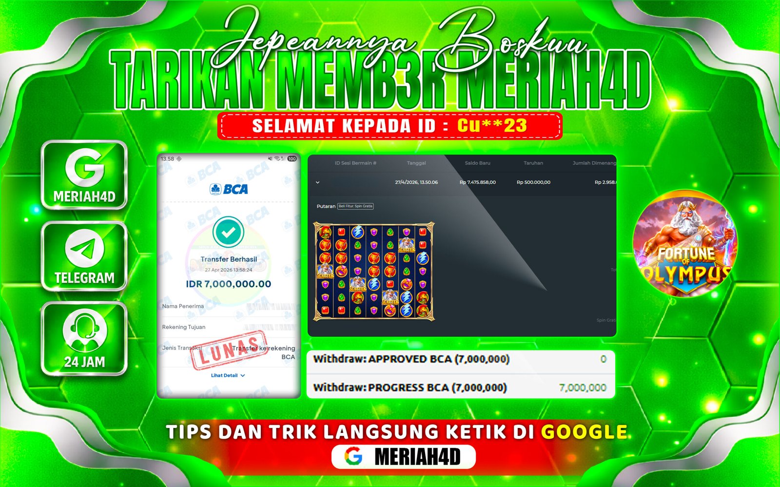 Selamat Kepada ID : Cu**23 Atas Withdraw Rp. 7.000.000 Juta Hari ini. Ditunggu Withdraw Selanjutnya dan ajak juga teman temannya bergabung di Meriah4d