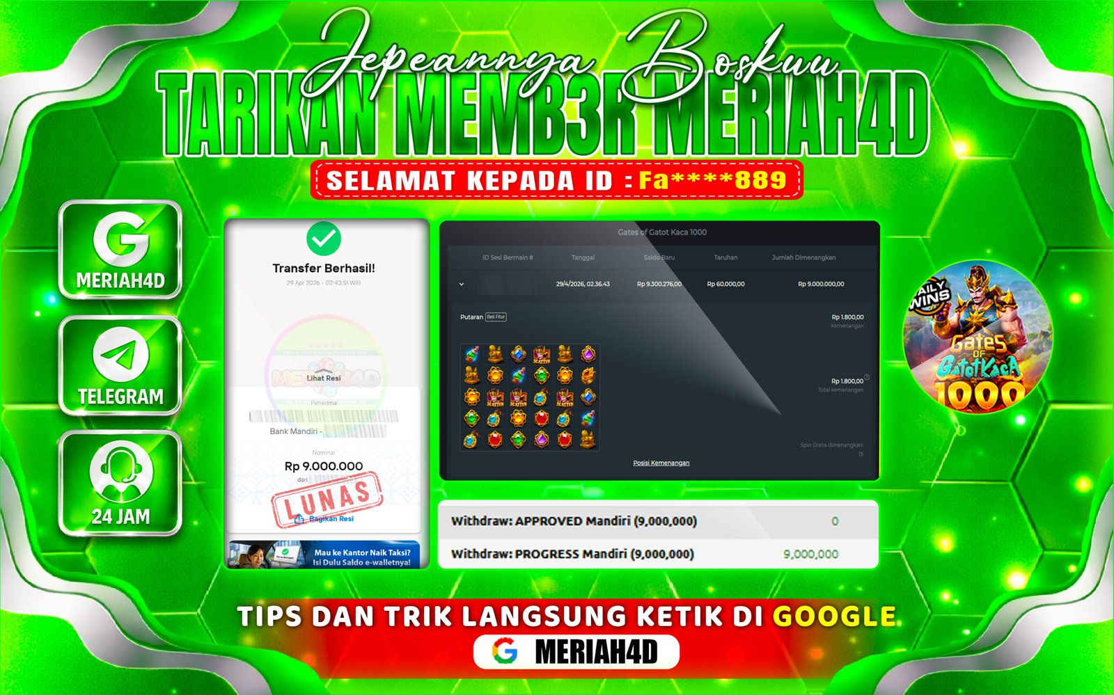 Selamat Kepada ID : Fa****889 Atas Withdraw Rp. 9.000.000 Juta Hari ini. Ditunggu Withdraw Selanjutnya dan ajak juga teman temannya bergabung di Meriah4d