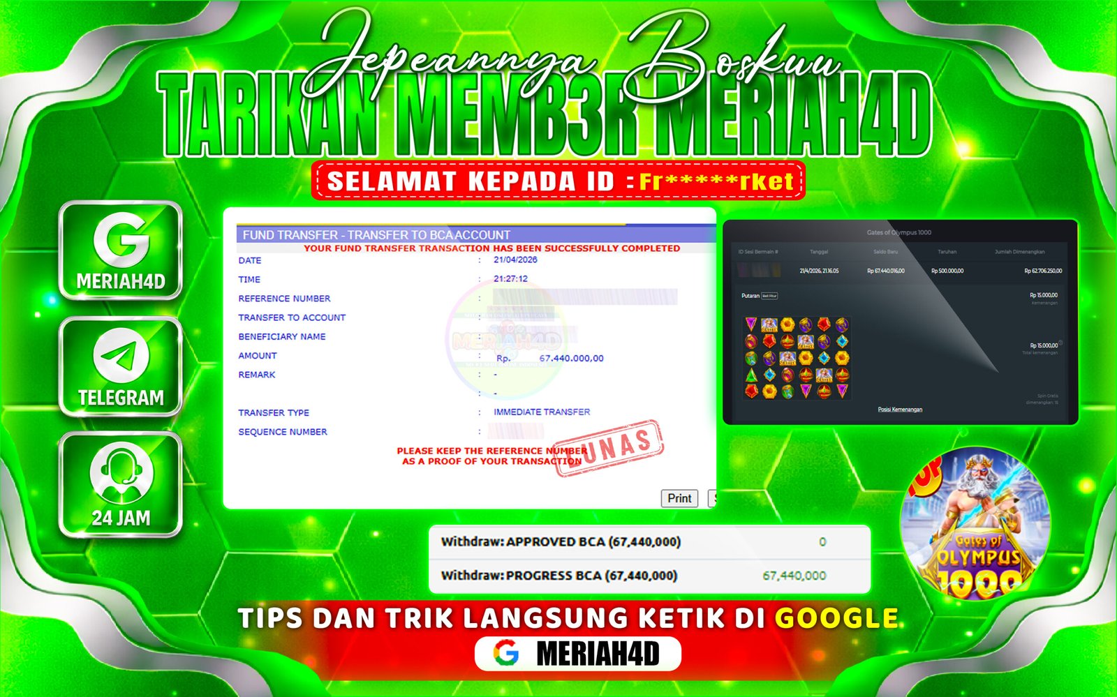 Selamat Kepada ID : Fr*****rket Atas Withdraw Rp. 67.440.000 Juta Hari ini. Ditunggu Withdraw Selanjutnya dan ajak juga teman temannya bergabung di Meriah4d