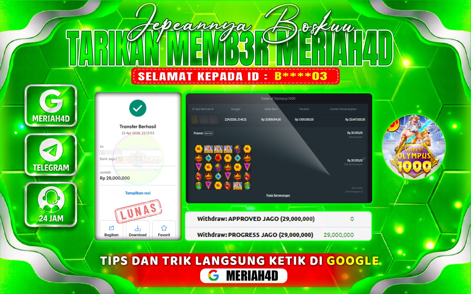 Selamat Kepada ID : B****03 Atas Withdraw Rp. 29.000.000 Juta Hari ini. Ditunggu Withdraw Selanjutnya dan ajak juga teman temannya bergabung di Meriah4d