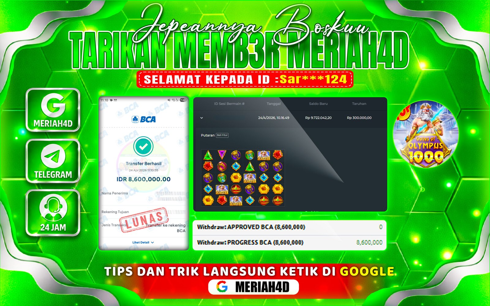 Selamat Kepada ID : Sar***124 Atas Withdraw Rp. 8.600.000 Juta Hari ini. Ditunggu Withdraw Selanjutnya dan ajak juga teman temannya bergabung di Meriah4d