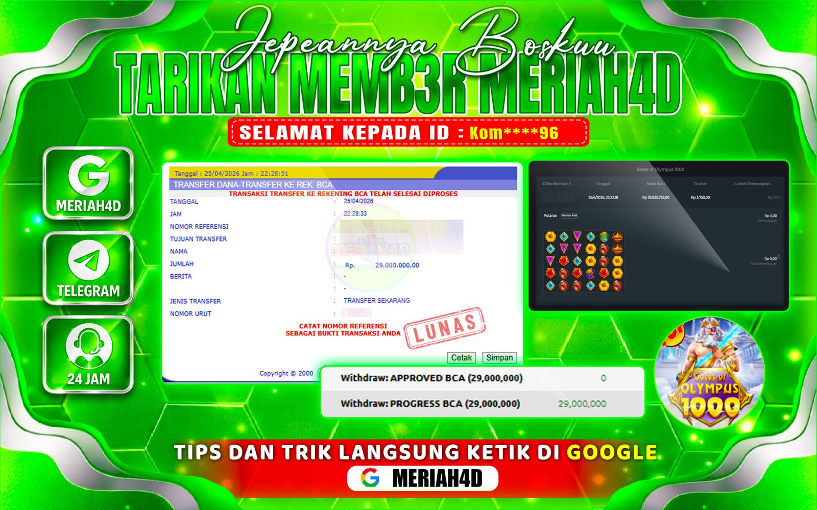 Selamat Kepada ID : Kom****96 Atas Withdraw Rp. 29.000.000 Juta Hari ini. Ditunggu Withdraw Selanjutnya dan ajak juga teman temannya bergabung di Meriah4d