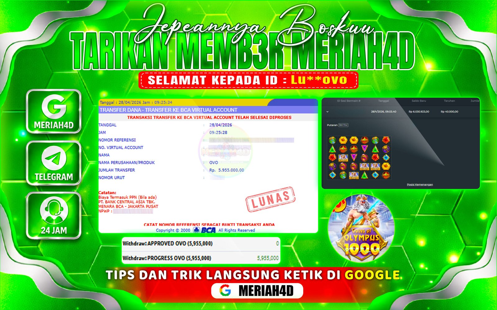 Selamat Kepada ID : Lu**ovo Atas Withdraw Rp. 5.955.000 Juta Hari ini. Ditunggu Withdraw Selanjutnya dan ajak juga teman temannya bergabung di Meriah4d