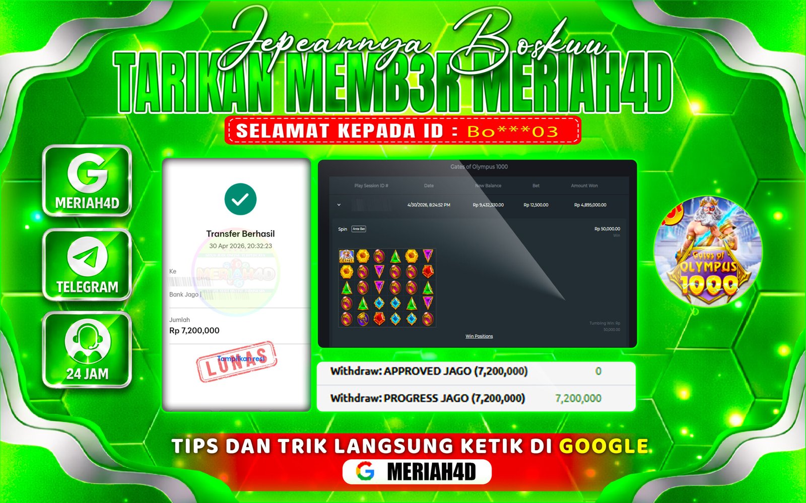 Selamat Kepada ID : Bo***03 dan Atas Withdraw Rp. 7.200.000 Juta Hari ini. Ditunggu Withdraw Selanjutnya dan ajak juga teman temannya bergabung di Meriah4d