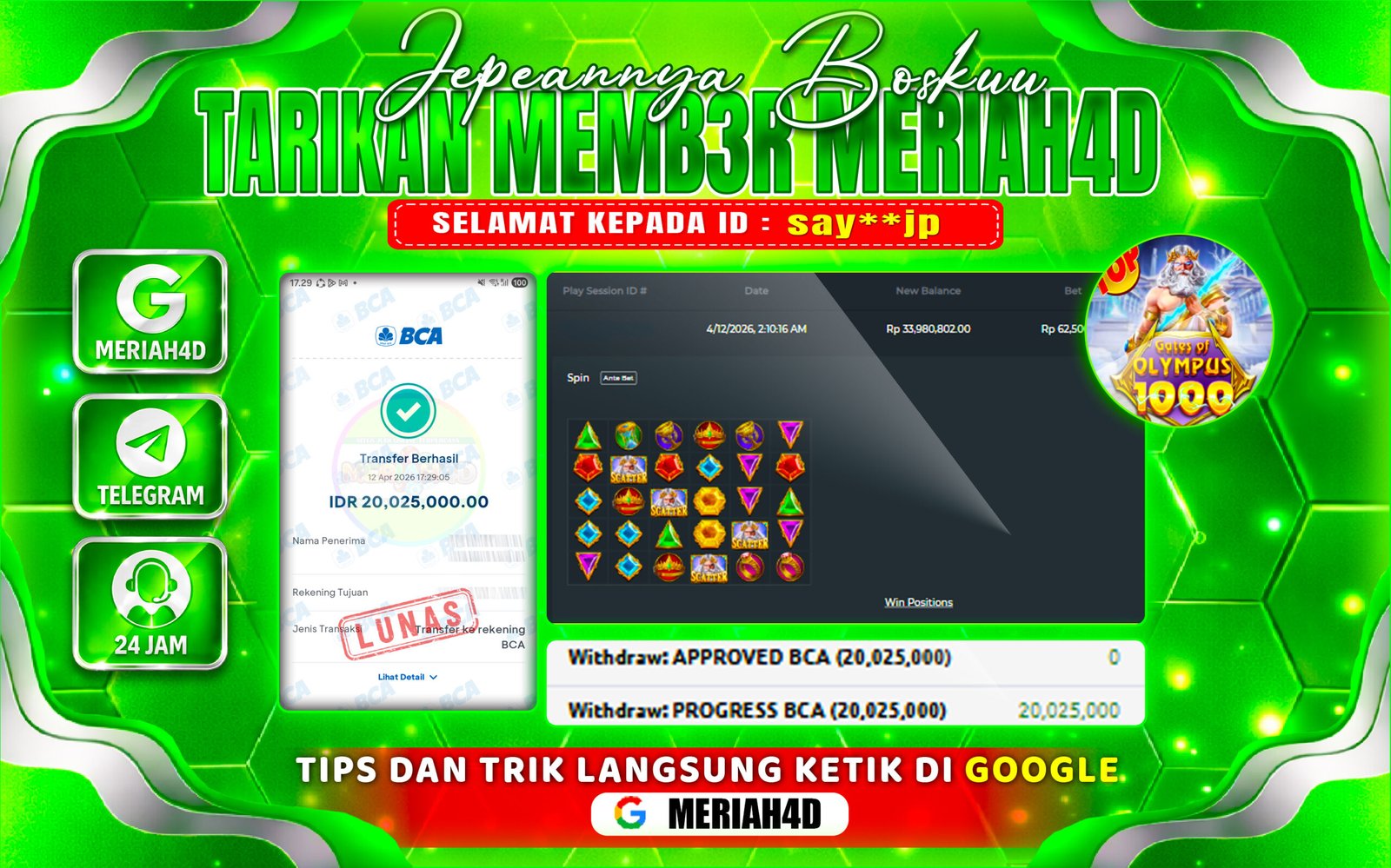 Selamat Kepada ID : say**jp Atas Withdraw Rp. 20.025.000 Juta Hari ini. Ditunggu Withdraw Selanjutnya dan ajak juga teman temannya bergabung di Meriah4d