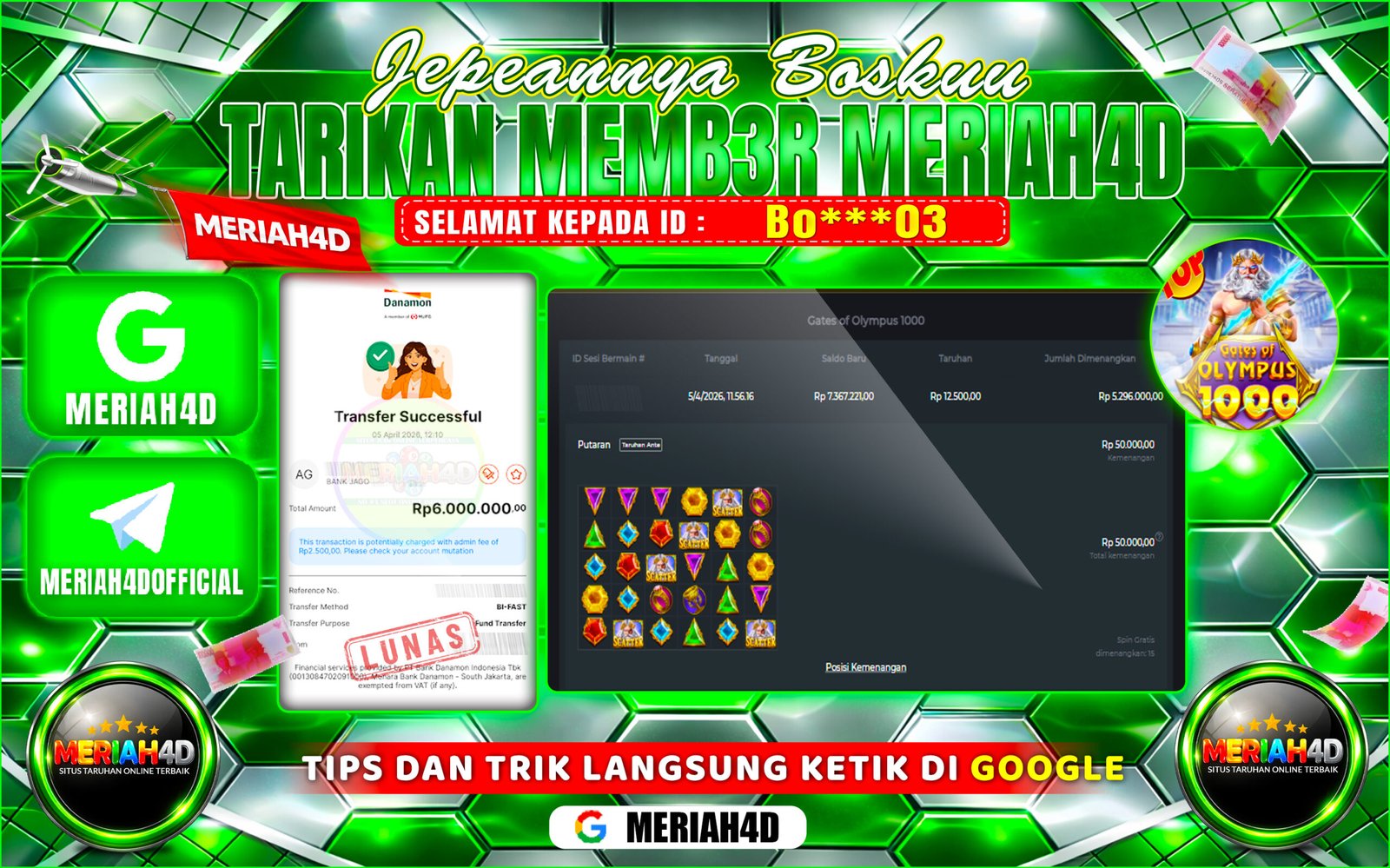 Selamat Kepada ID : Bo***03 Atas Withdraw Rp. 6.000.000 Juta Hari ini. Ditunggu Withdraw Selanjutnya dan ajak juga teman temannya bergabung di Meriah4d