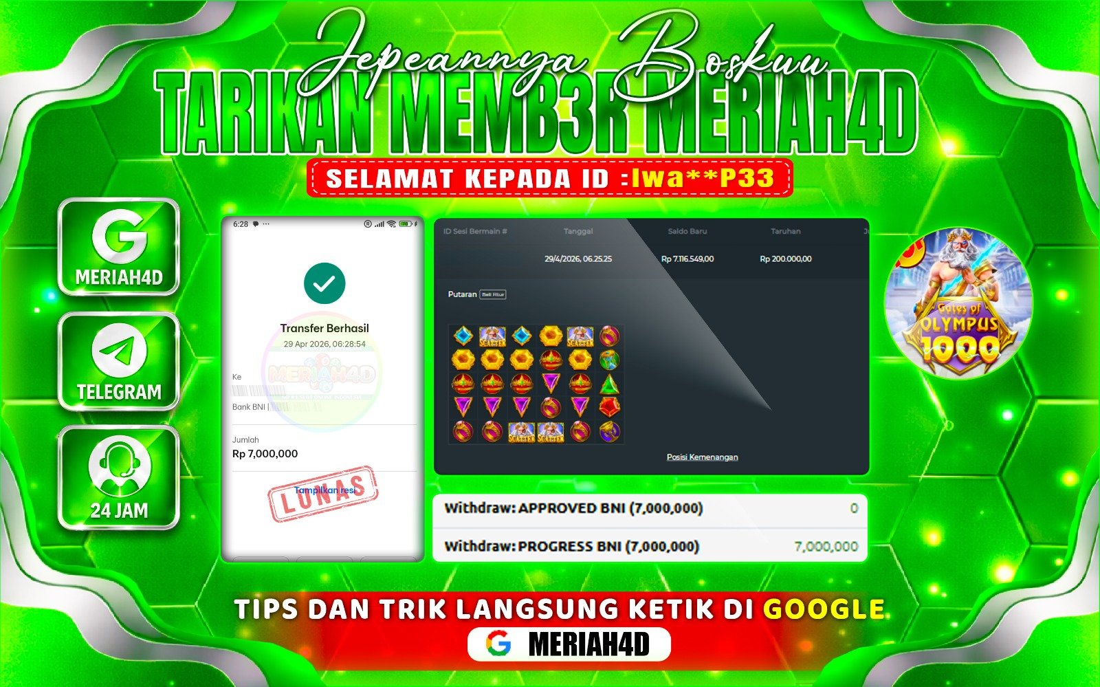 Selamat Kepada ID : Iwa**p33 dan Atas Withdraw Rp. 7.000.000 Juta Hari ini. Ditunggu Withdraw Selanjutnya dan ajak juga teman temannya bergabung di Meriah4d
