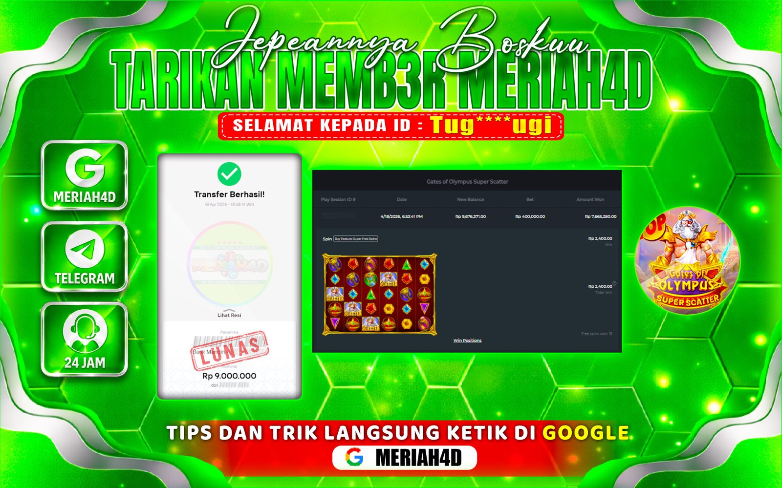 Selamat Kepada ID : Tug****ugi Atas Withdraw Rp. 9.000.000 Juta Hari ini. Ditunggu Withdraw Selanjutnya dan ajak juga teman temannya bergabung di Meriah4d