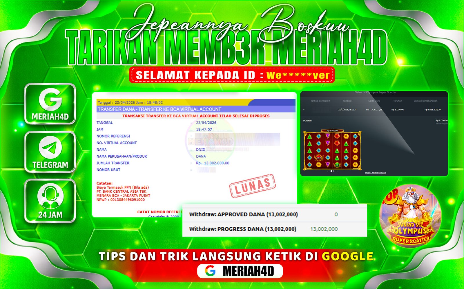 Selamat Kepada ID : We*****ver Atas Withdraw Rp. 13.000.000 Juta Hari ini. Ditunggu Withdraw Selanjutnya dan ajak juga teman temannya bergabung di Meriah4d