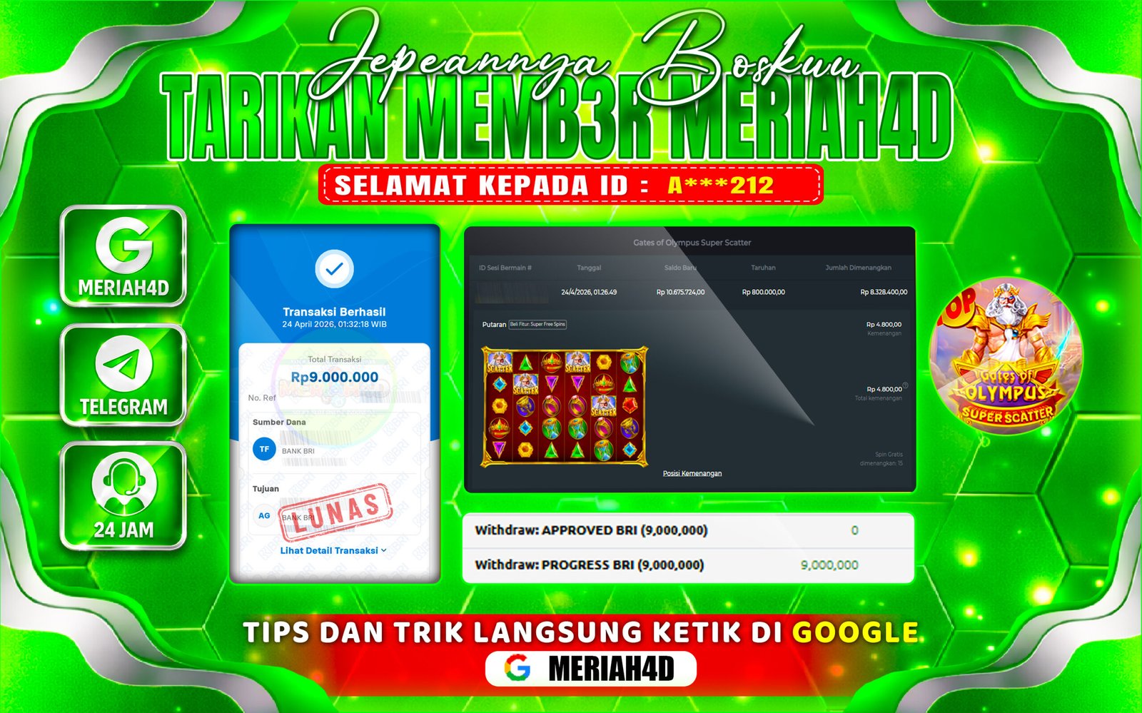 Selamat Kepada ID : A***212 Atas Withdraw Rp. 9.000.000 Juta Hari ini. Ditunggu Withdraw Selanjutnya dan ajak juga teman temannya bergabung di Meriah4d