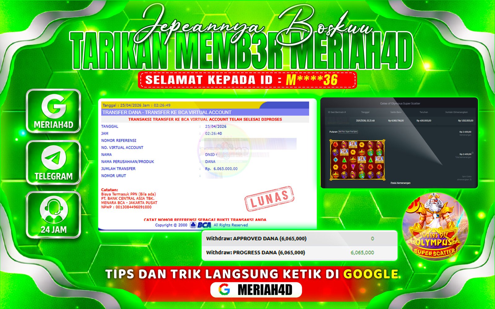 Selamat Kepada ID : M****36 Atas Withdraw Rp. 6.065.000 Juta Hari ini. Ditunggu Withdraw Selanjutnya dan ajak juga teman temannya bergabung di Meriah4d