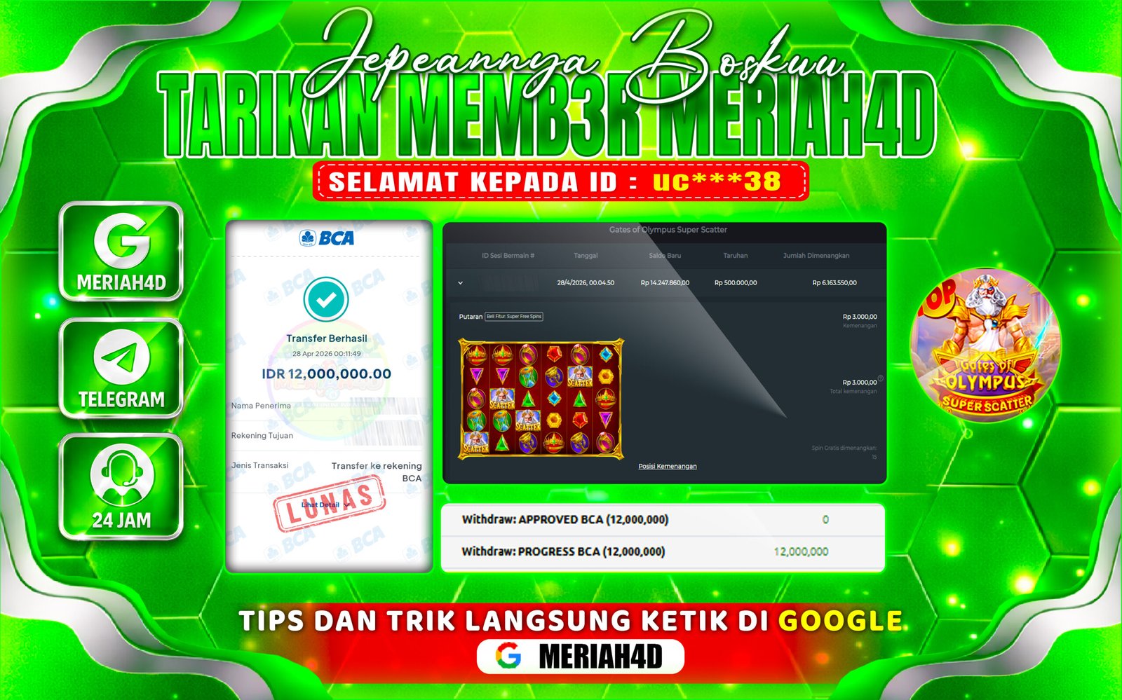 Selamat Kepada ID : uc***38 dan Atas Withdraw Rp. 12.000.000 Juta Hari ini. Ditunggu Withdraw Selanjutnya dan ajak juga teman temannya bergabung di Meriah4d