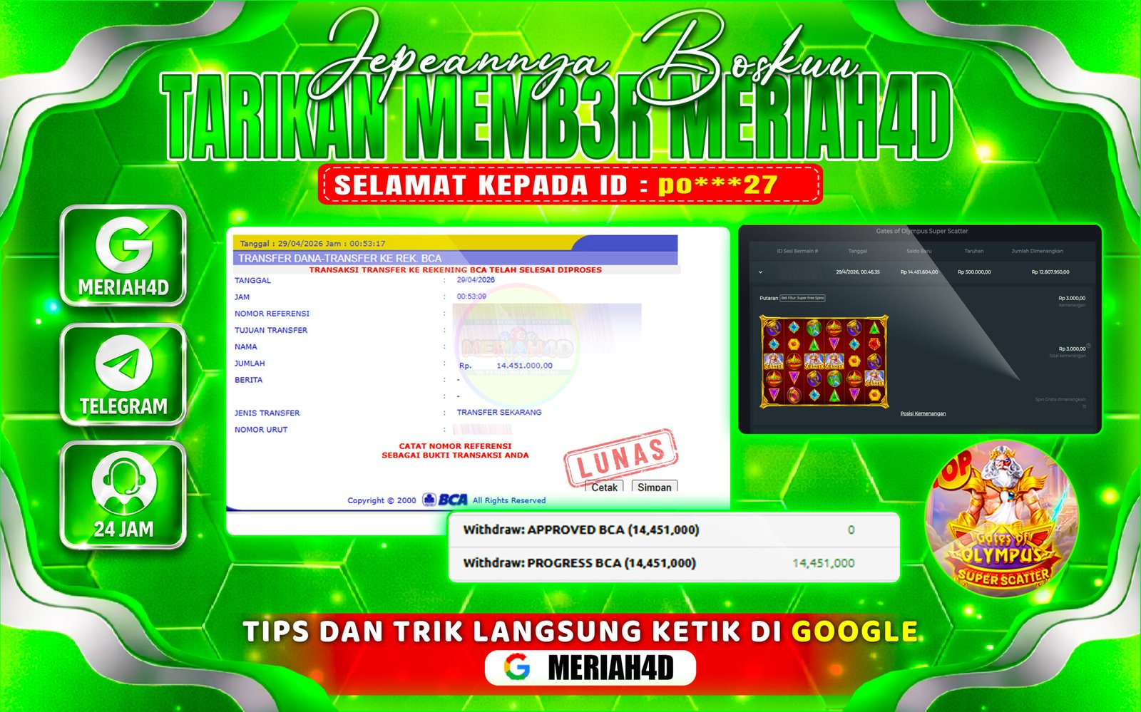 Selamat Kepada ID : po***27 Atas Withdraw Rp. 14.451.000 Juta Hari ini. Ditunggu Withdraw Selanjutnya dan ajak juga teman temannya bergabung di Meriah4d