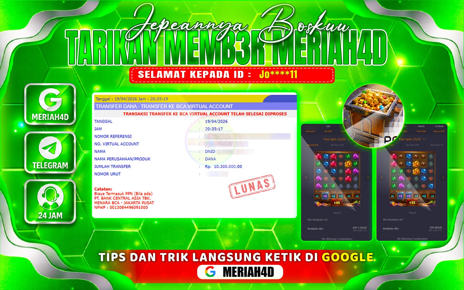 Selamat Kepada ID : Jo****11 Atas Withdraw Rp. 10.300.000 Juta Hari ini. Ditunggu Withdraw Selanjutnya dan ajak juga teman temannya bergabung di Meriah4d