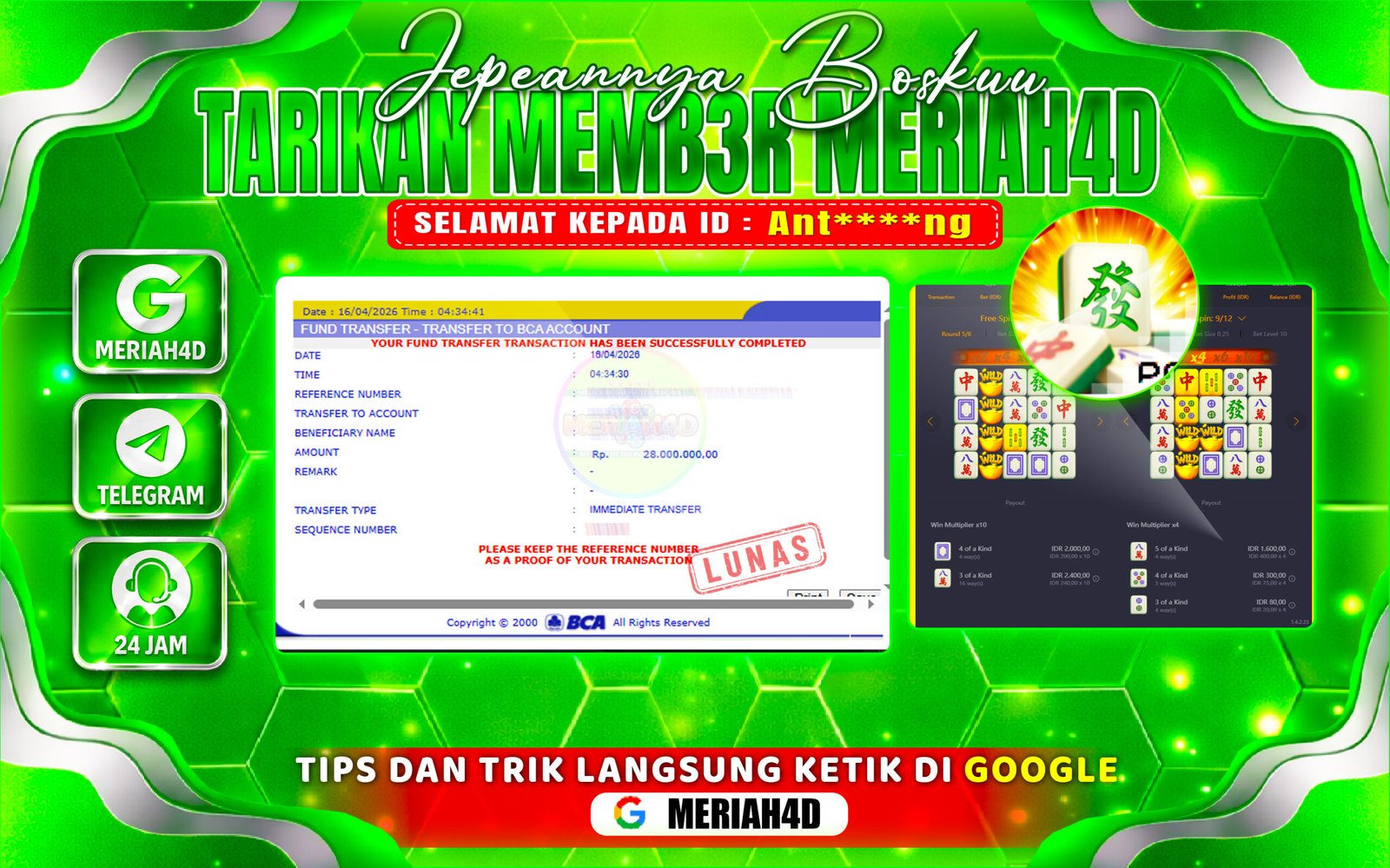 BUKTI KEMENANGAN MERIAH4D GAME SLOT (MAHJONG WAYS)