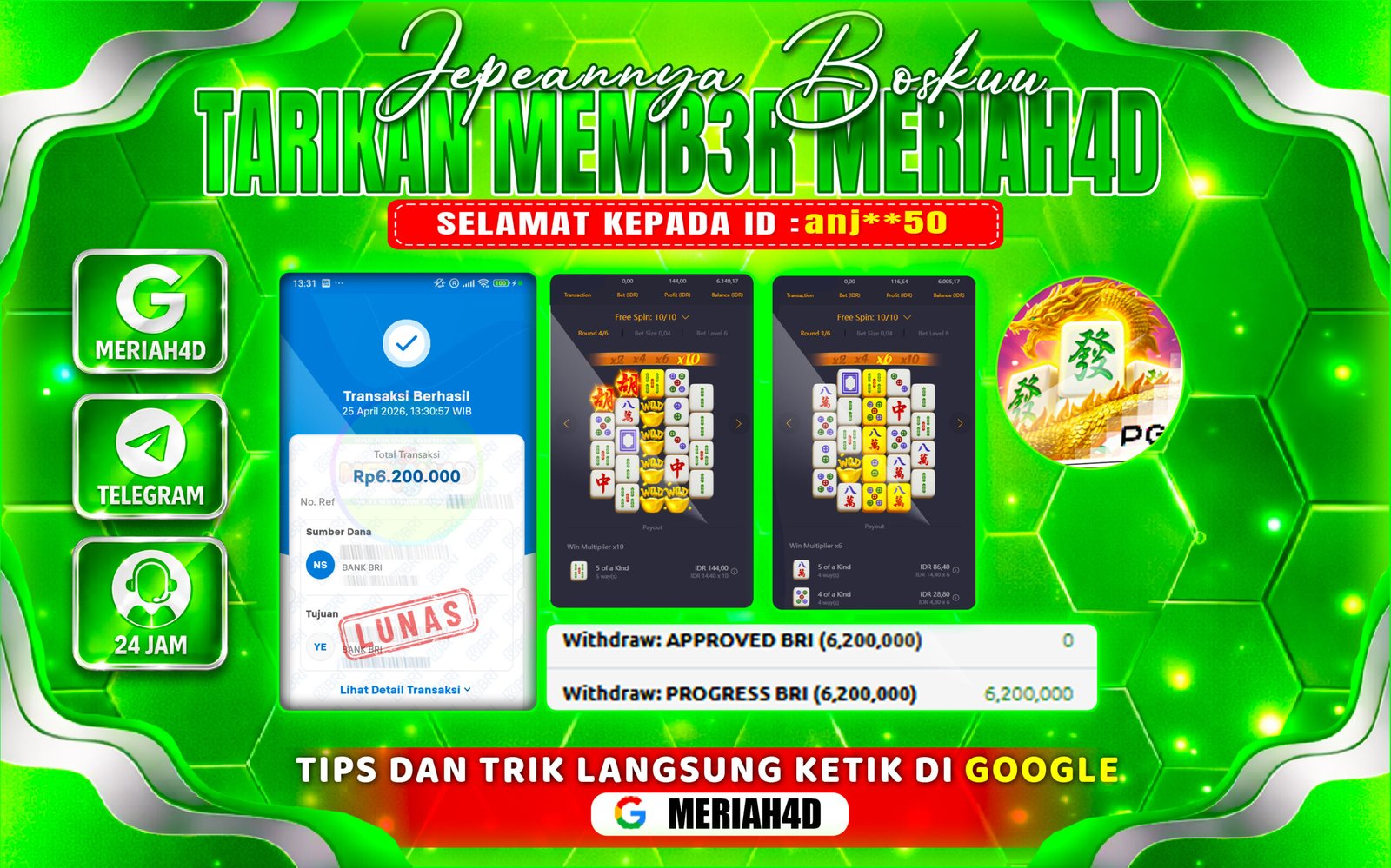 Selamat Kepada ID : anj**50 Atas Withdraw Rp. 6.200.000 Juta Hari ini. Ditunggu Withdraw Selanjutnya dan ajak juga teman temannya bergabung di Meriah4d