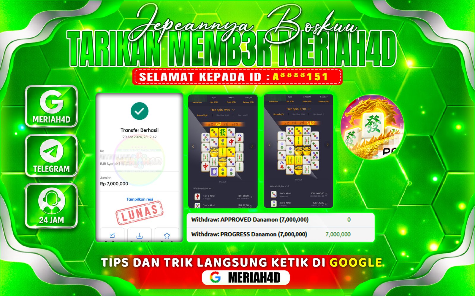 Selamat Kepada ID : A****151 dan Atas Withdraw Rp. 7.000.000 Juta Hari ini. Ditunggu Withdraw Selanjutnya dan ajak juga teman temannya bergabung di Meriah4d