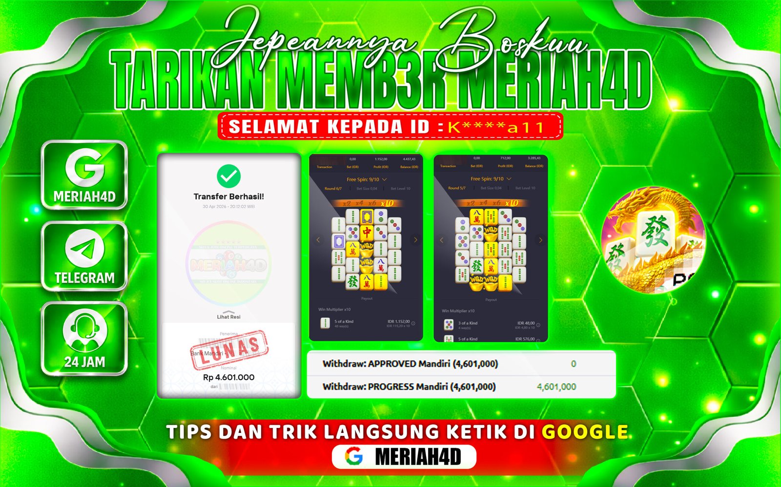 Selamat Kepada ID : K****a11 dan Atas Withdraw Rp. 4.601.000 Juta Hari ini. Ditunggu Withdraw Selanjutnya dan ajak juga teman temannya bergabung di Meriah4d