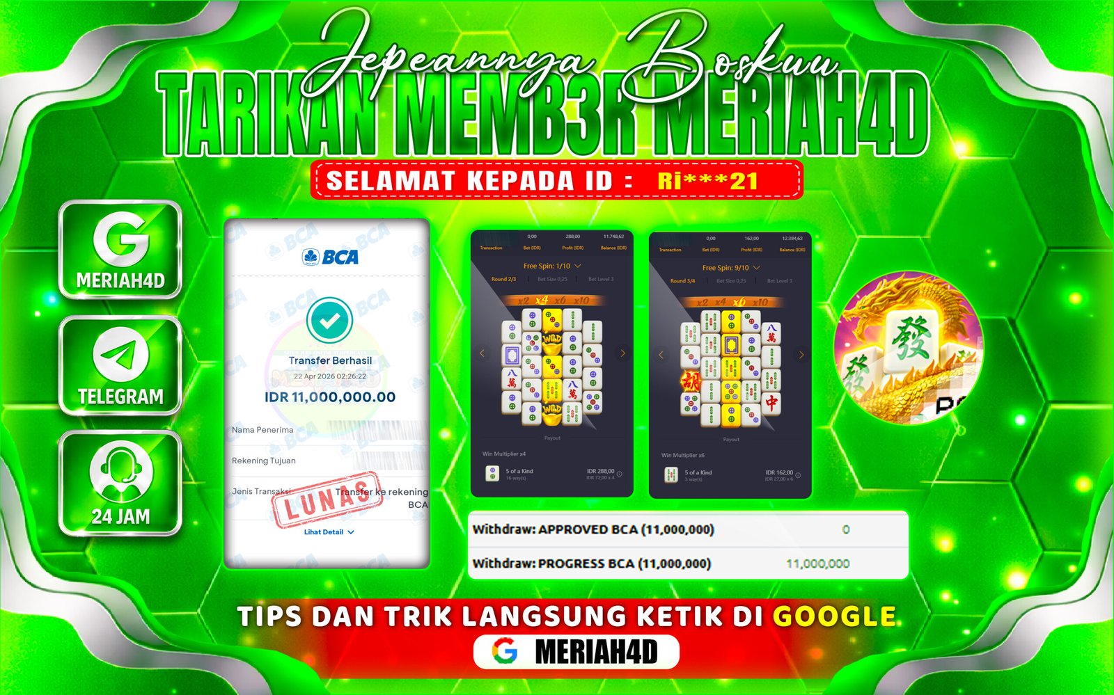 Selamat Kepada ID : Ri***21 Atas Withdraw Rp. 11.000.000 Juta Hari ini. Ditunggu Withdraw Selanjutnya dan ajak juga teman temannya bergabung di Meriah4d