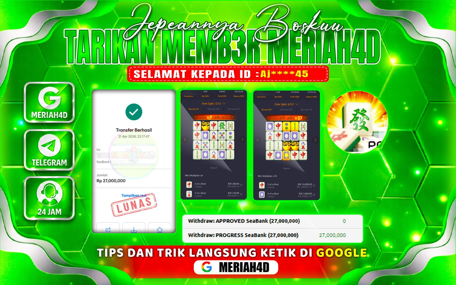 Selamat Kepada ID : Aj****45 Atas Withdraw Rp. 27.000.000 Juta Hari ini. Ditunggu Withdraw Selanjutnya dan ajak juga teman temannya bergabung di Meriah4d