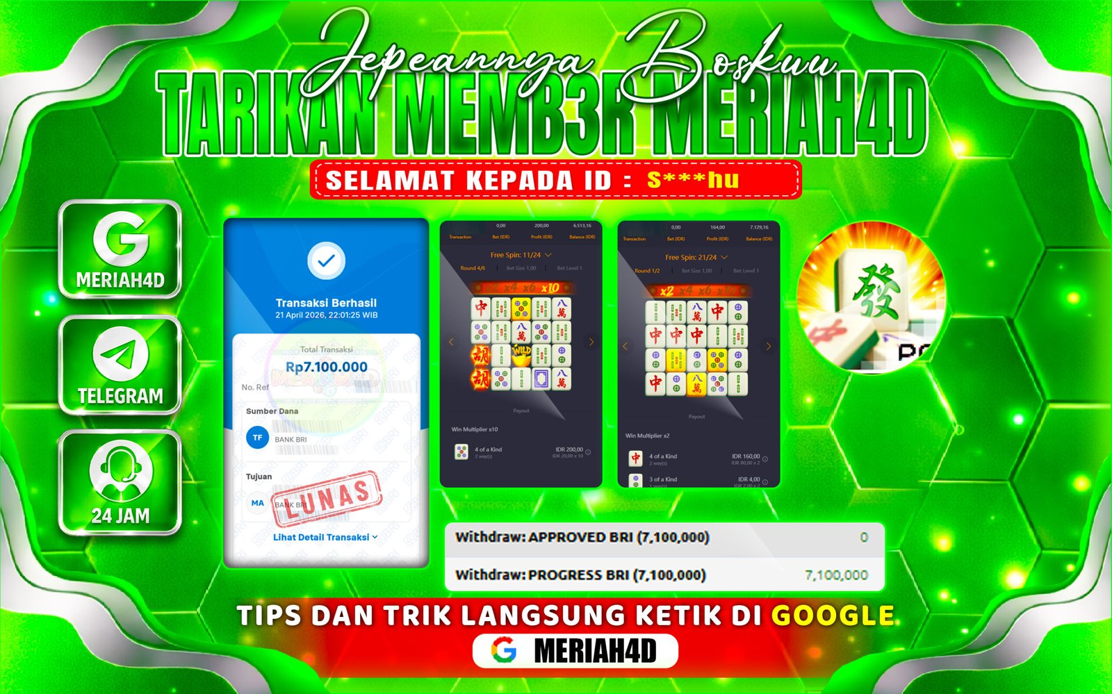 Selamat Kepada ID : S***hu Atas Withdraw Rp. 7.100.000 Juta Hari ini. Ditunggu Withdraw Selanjutnya dan ajak juga teman temannya bergabung di Meriah4d