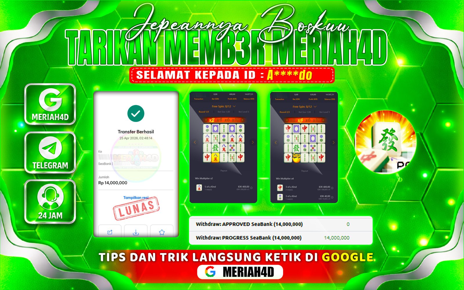 Selamat Kepada ID : A****do Atas Withdraw Rp. 14.000.000 Juta Hari ini. Ditunggu Withdraw Selanjutnya dan ajak juga teman temannya bergabung di Meriah4d