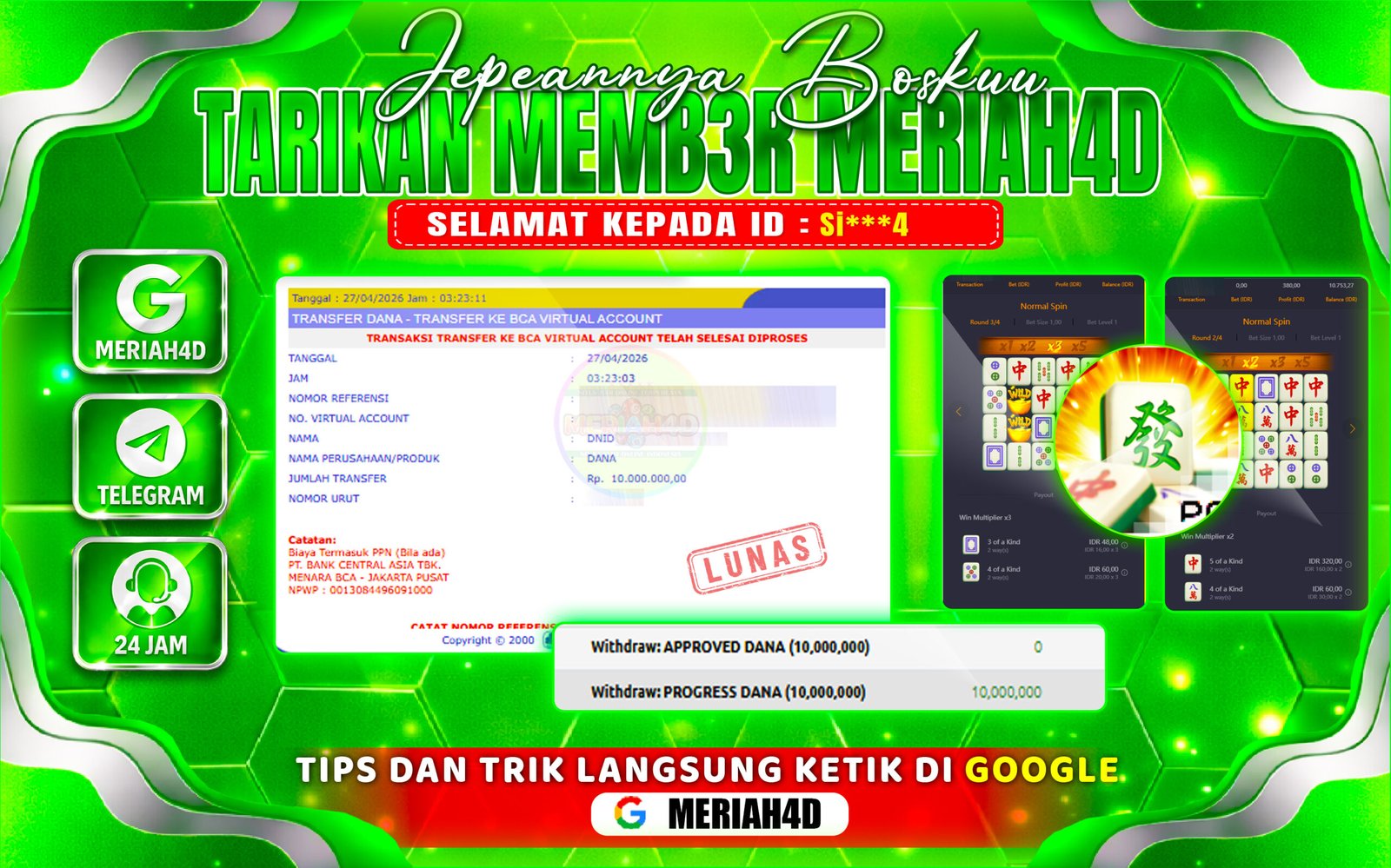 Selamat Kepada ID : Si***4 Atas Withdraw Rp. 10.000.000 Juta Hari ini. Ditunggu Withdraw Selanjutnya dan ajak juga teman temannya bergabung di Meriah4d