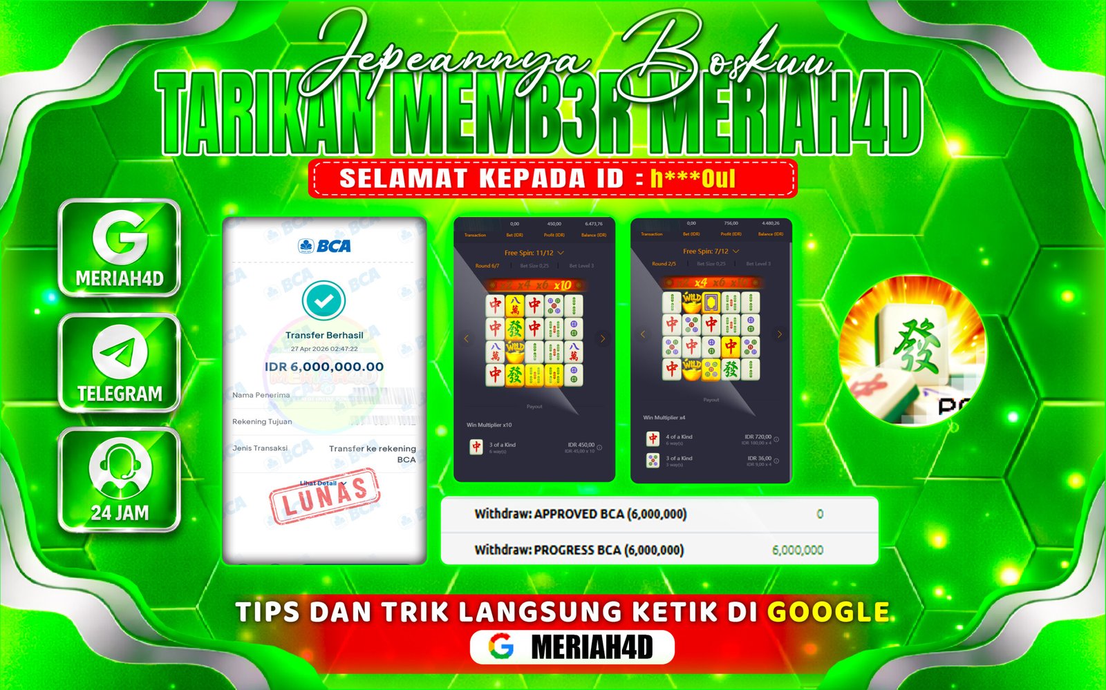 Selamat Kepada ID : h***0ul Atas Withdraw Rp. 6.000.000 Juta Hari ini. Ditunggu Withdraw Selanjutnya dan ajak juga teman temannya bergabung di Meriah4d