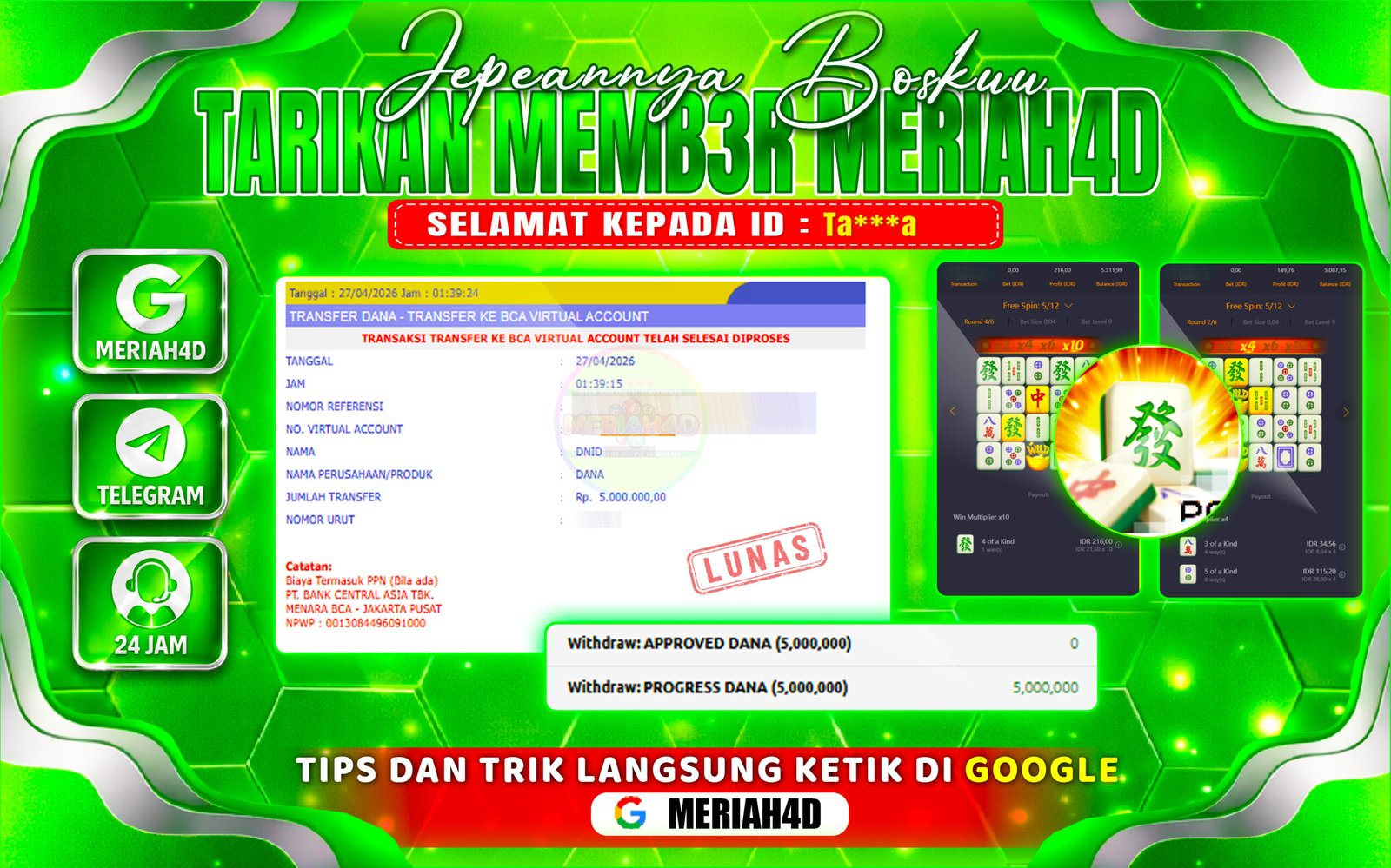 Selamat Kepada ID : Ta***a Atas Withdraw Rp. 5.000.000 Juta Hari ini. Ditunggu Withdraw Selanjutnya dan ajak juga teman temannya bergabung di Meriah4d