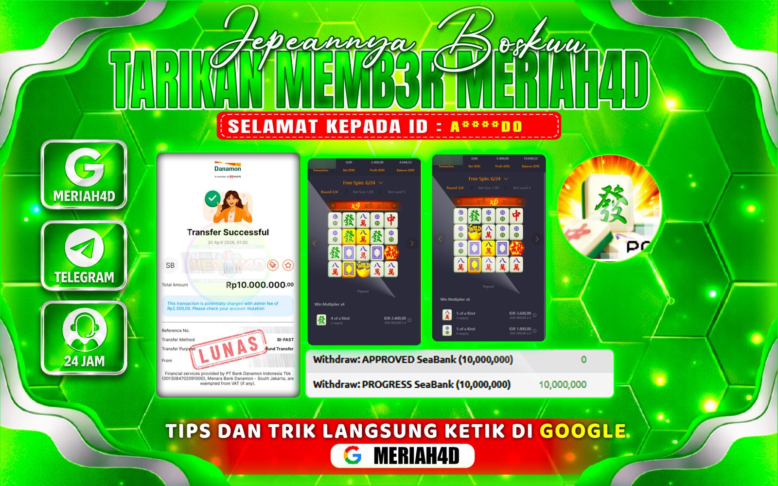 Selamat Kepada ID : A***do dan Atas Withdraw Rp. 10.0000.000 Juta Hari ini. Ditunggu Withdraw Selanjutnya dan ajak juga teman temannya bergabung di Meriah4d