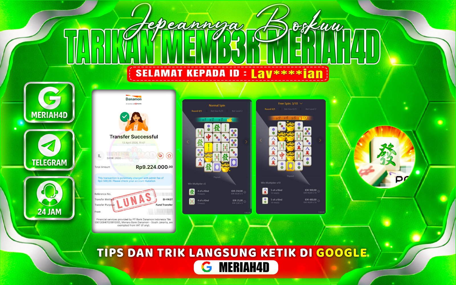 Selamat Kepada ID : Lav****ian Atas Withdraw Rp. 9.224.000 Juta Hari ini. Ditunggu Withdraw Selanjutnya dan ajak juga teman temannya bergabung di Meriah4d