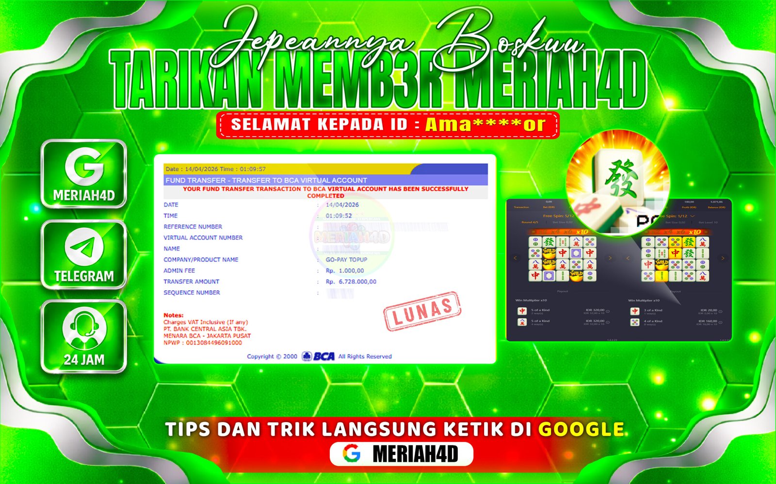 Selamat Kepada ID : Ama****or Atas Withdraw Rp. 6.728.000 Juta Hari ini. Ditunggu Withdraw Selanjutnya dan ajak juga teman temannya bergabung di Meriah4d