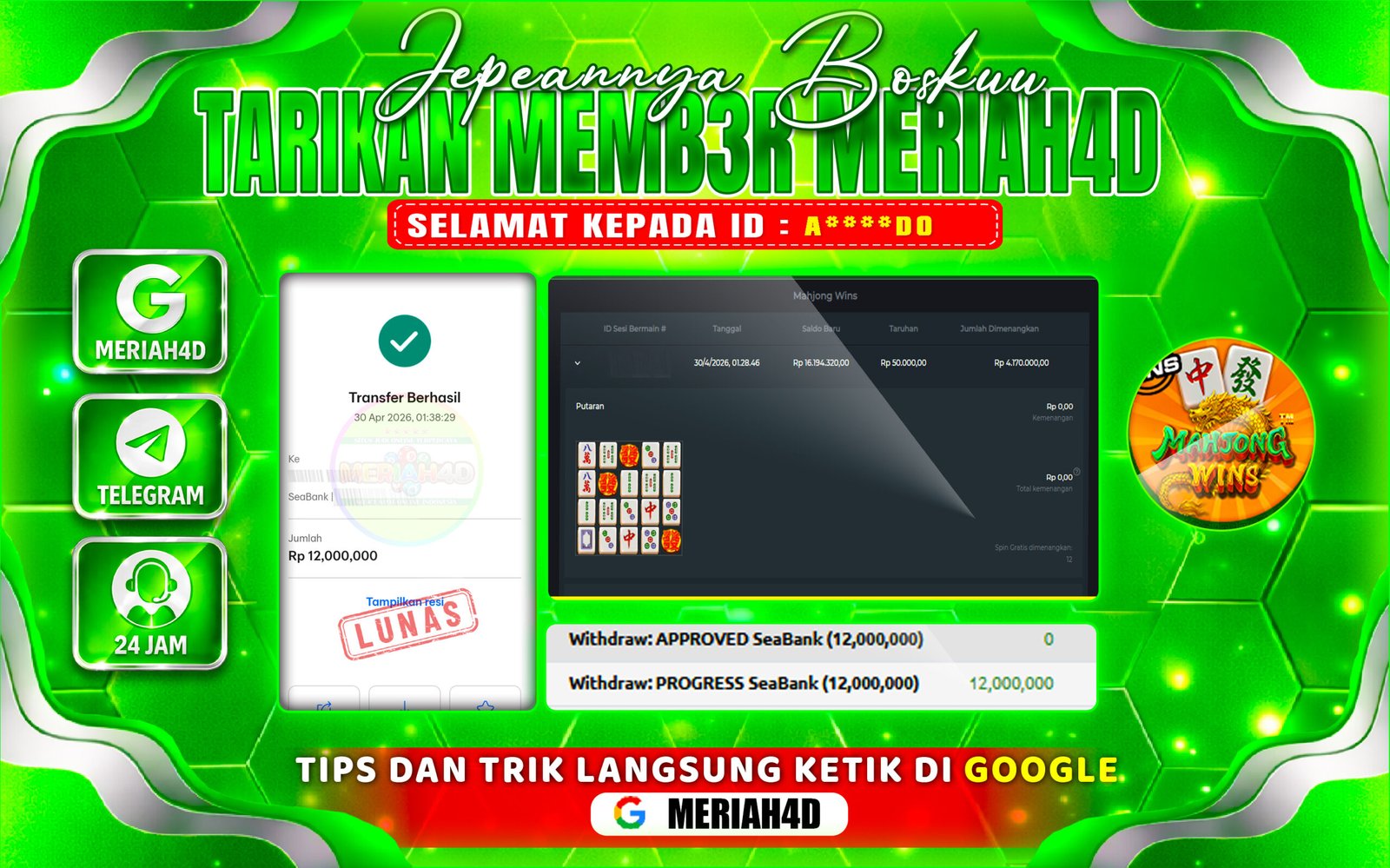 Selamat Kepada ID : A****do dan Atas Withdraw Rp. 12.000.000 Juta Hari ini. Ditunggu Withdraw Selanjutnya dan ajak juga teman temannya bergabung di Meriah4d