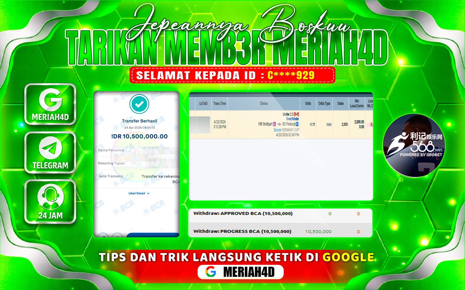 Selamat Kepada ID : C****929 Atas Withdraw Rp. 10.500.000 Juta Hari ini. Ditunggu Withdraw Selanjutnya dan ajak juga teman temannya bergabung di Meriah4d