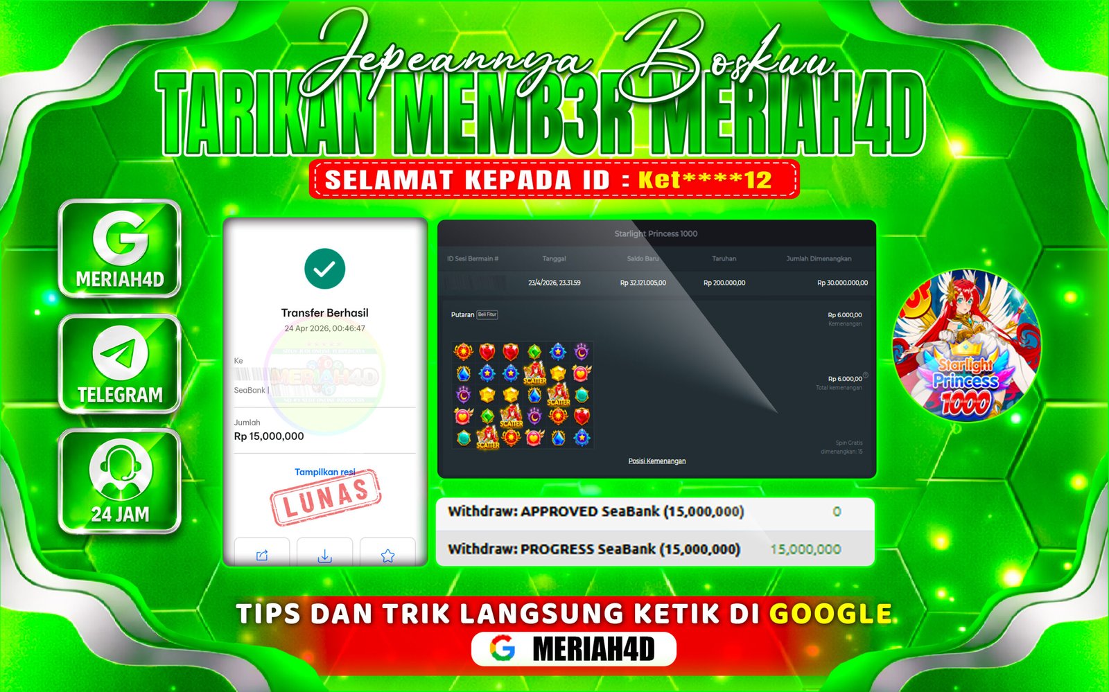Selamat Kepada ID : Ket****12 Atas Withdraw Rp. 15.000.000 Juta Hari ini. Ditunggu Withdraw Selanjutnya dan ajak juga teman temannya bergabung di Meriah4d