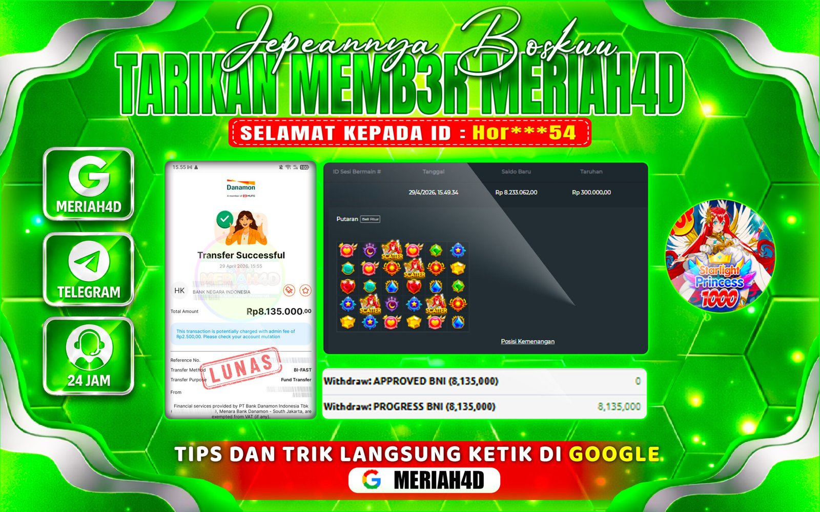 Selamat Kepada ID : Hor***54 Atas Withdraw Rp. 8.135.000 Juta Hari ini. Ditunggu Withdraw Selanjutnya dan ajak juga teman temannya bergabung di Meriah4d