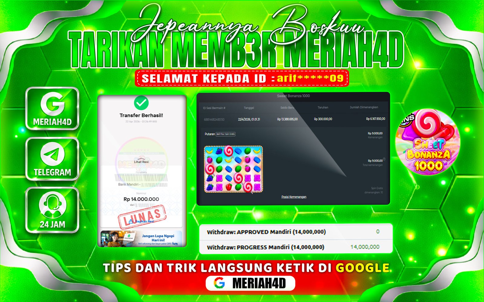 Selamat Kepada ID : arif*****09 Atas Withdraw Rp. 14.000.000 Juta Hari ini. Ditunggu Withdraw Selanjutnya dan ajak juga teman temannya bergabung di Meriah4d