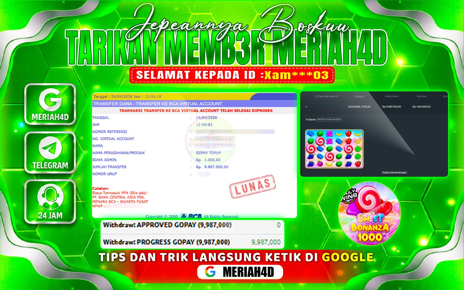 Selamat Kepada ID : Xam***03 Atas Withdraw Rp. 9.987.000 Juta Hari ini. Ditunggu Withdraw Selanjutnya dan ajak juga teman temannya bergabung di Meriah4d