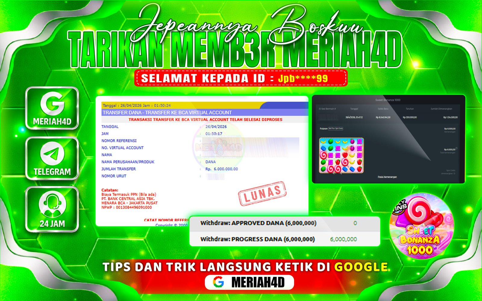 Selamat Kepada ID : Jpb****99 Atas Withdraw Rp. 6.000.000 Juta Hari ini. Ditunggu Withdraw Selanjutnya dan ajak juga teman temannya bergabung di Meriah4d