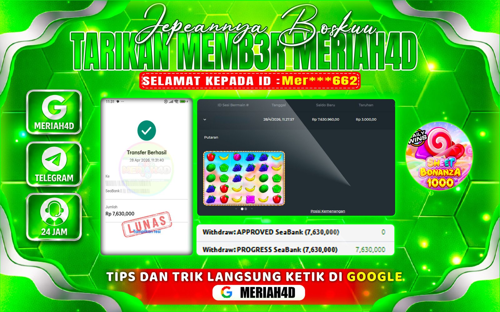 Selamat Kepada ID : Mer***662 Atas Withdraw Rp. 7.630.000 Juta Hari ini. Ditunggu Withdraw Selanjutnya dan ajak juga teman temannya bergabung di Meriah4d
