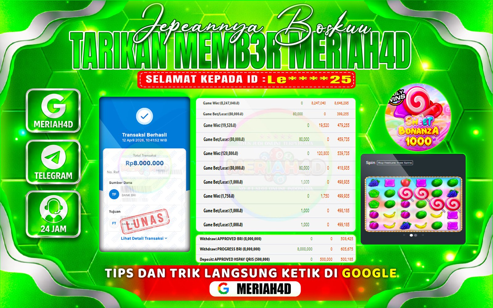 Selamat Kepada ID : Le****25 Atas Withdraw Rp. 8.000.000 Juta Hari ini. Ditunggu Withdraw Selanjutnya dan ajak juga teman temannya bergabung di Meriah4d