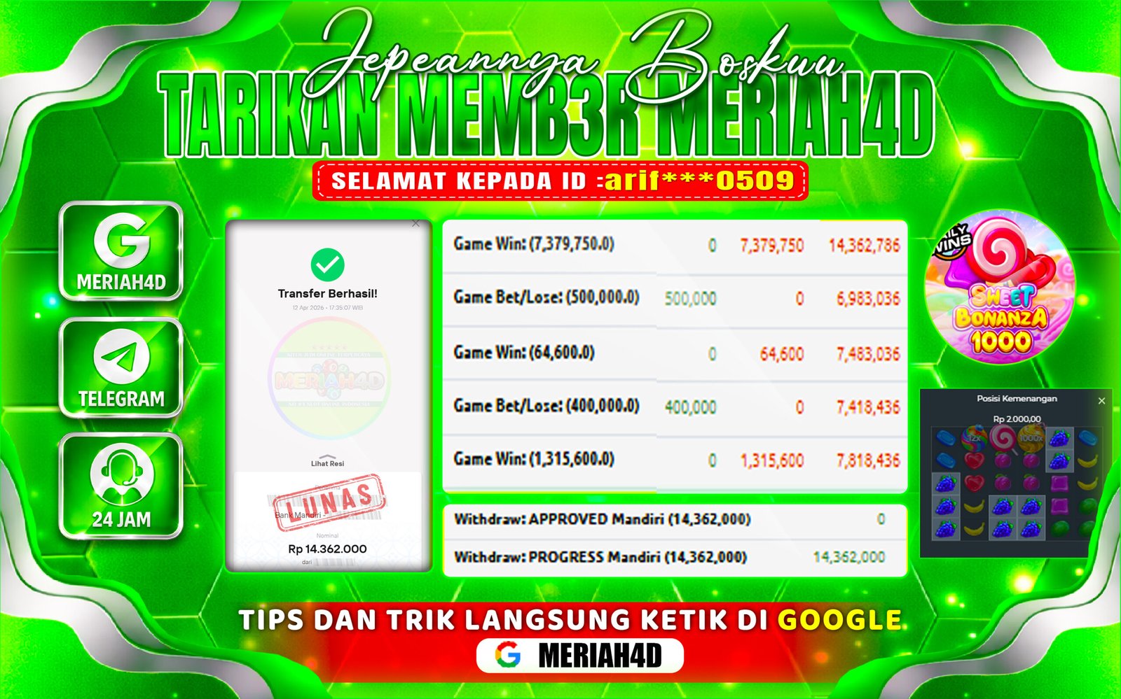 Selamat Kepada ID : arif****0509 Atas Withdraw Rp. 14.362.000 Juta Hari ini. Ditunggu Withdraw Selanjutnya dan ajak juga teman temannya bergabung di Meriah4d
