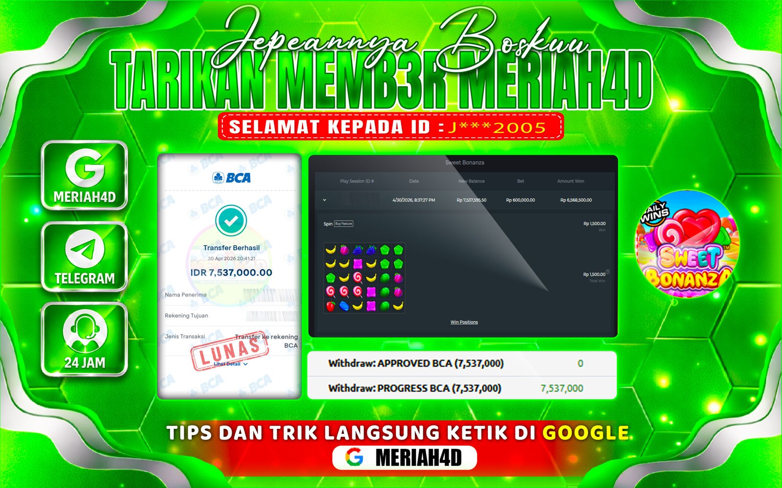 Selamat Kepada ID : J***2005 dan Atas Withdraw Rp. 7.537.000 Juta Hari ini. Ditunggu Withdraw Selanjutnya dan ajak juga teman temannya bergabung di Meriah4d