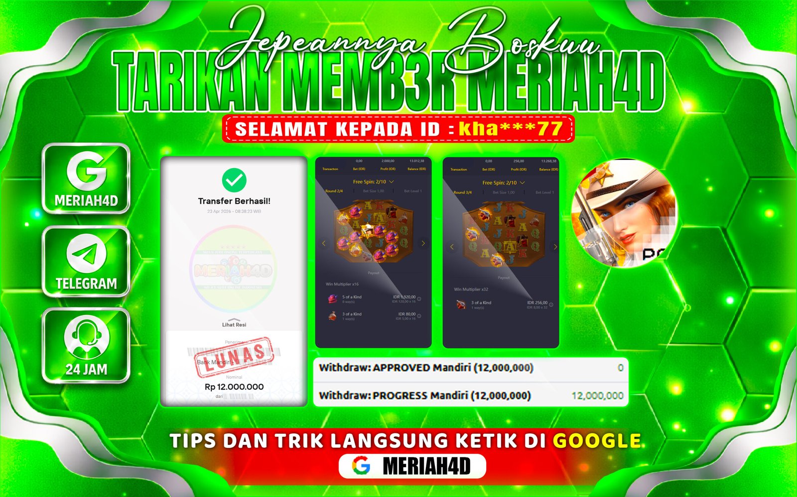 Selamat Kepada ID : kha***77 Atas Withdraw Rp. 12.000.000 Juta Hari ini. Ditunggu Withdraw Selanjutnya dan ajak juga teman temannya bergabung di Meriah4d