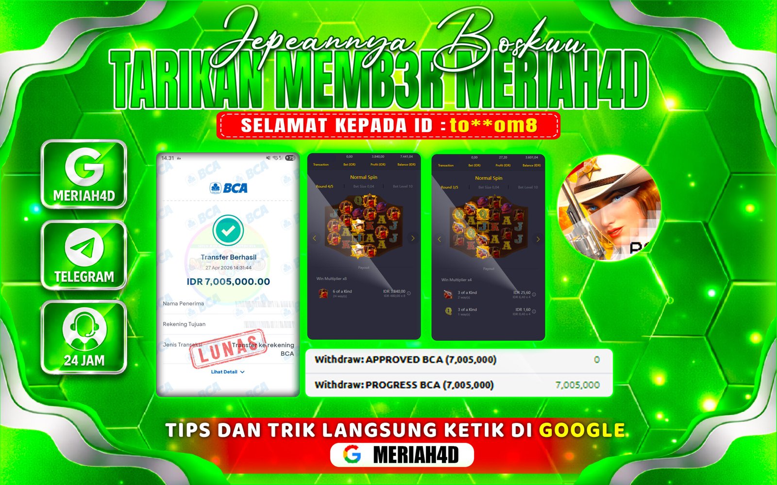 Selamat Kepada ID : to**om8 Atas Withdraw Rp. 7.005.000 Juta Hari ini. Ditunggu Withdraw Selanjutnya dan ajak juga teman temannya bergabung di Meriah4d